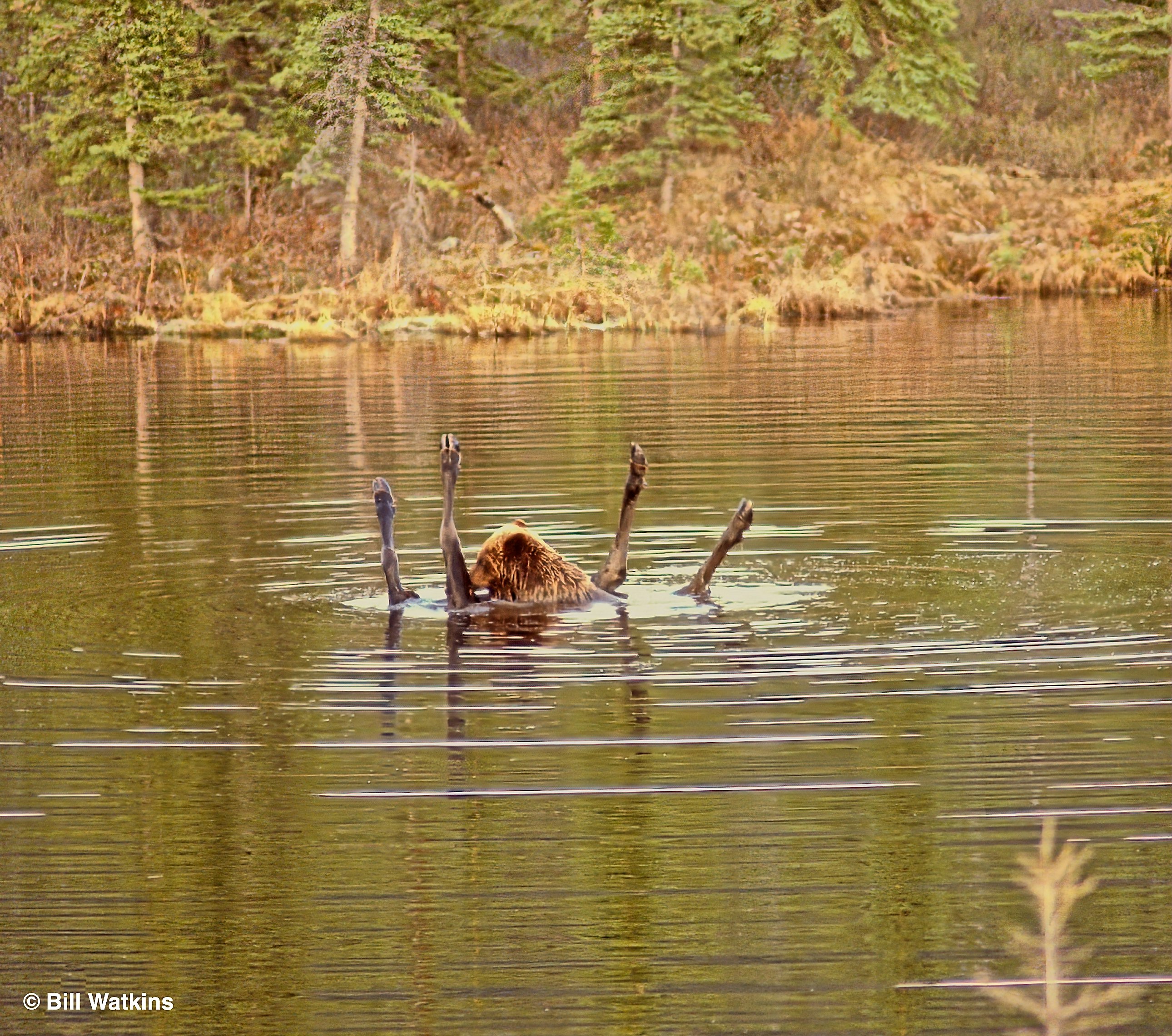A friend of mine, Pete Johnson had to commute to work into the park each day, and so we were able to monitor the situation, hoping that the bear would return and drag the moose carcass to the shore.